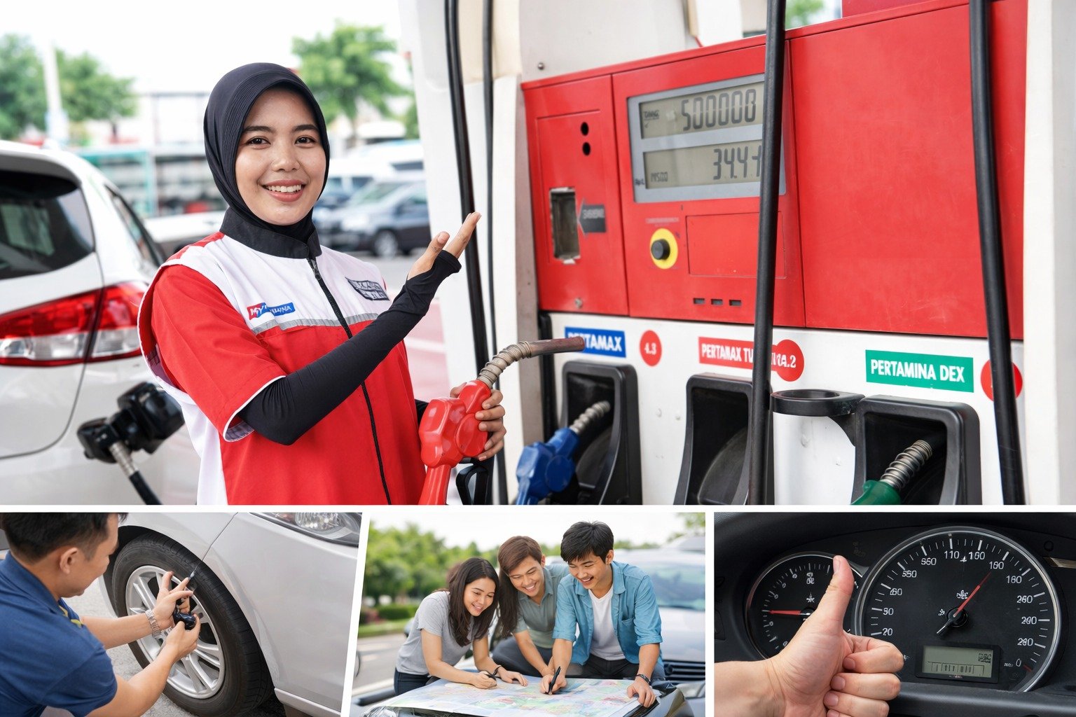 Ilustrasi aktivitas pengisian bahan bakar yang dipadukan dengan kebiasaan sederhana seperti pengecekan kendaraan dan perencanaan perjalanan, sebagai upaya mendukung penggunaan BBM yang lebih hemat dan efisien dalam kehidupan sehari-hari. (sumber: chatgpt)