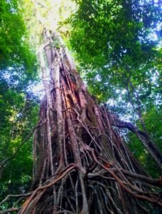 Masuk lebih dalam ke jalur trekking di sekitar pantai, Anda akan menemukan pohon Kiara raksasa. Pohon ini bukan sembarang tumbuhan; ia adalah jenis pohon pencekik (strangler fig) yang telah hidup selama ratusan tahun.