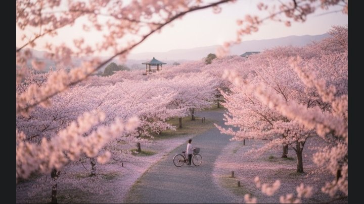 Adegan ditutup dengan pemandangan luas taman sakura dari kejauhan. Pengendara sepeda berdiri di samping sepedanya, dikelilingi lautan bunga merah muda. Pencahayaan golden hour menambah nuansa hangat, sementara color grading lembut menonjolkan kesan nostalgia.