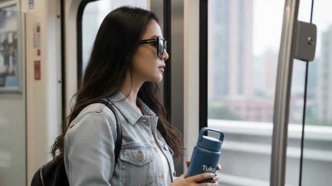 Perempuan berdiri di dekat pintu MRT, memegang tumbler biru Tuku dengan kedua tangan, memakai jaket denim dan tas punggung, rambut wavy alami, ekspresi fokus, latar kota terlihat dari jendela, cahaya kontras lembut, tone urban cinematic.