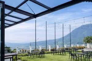 Banyak kafe di kawasan ini menawarkan area duduk outdoor yang langsung menghadap perbukitan.