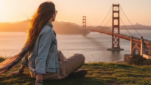 Landscape shot traveler duduk santai di bukit San Francisco menghadap Golden Gate Bridge saat matahari terbenam. Pose “Relaxed Sitting Pose” bersila, tangan menopang ke belakang. Outfit bohemian: Jaket denim, kaos putih, celana longgar earthy tone, gelang etnik, syal tipis. Rambut terurai tertiup angin. Nuansa golden hour oranye keemasan, suasana tenang, komposisi landscape luas dan fotorealistik.