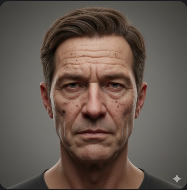 Tampilkan efek penuaan seperti kerutan, flek, dan perubahan warna kulit.