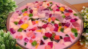 Beberapa pilihan buah diantaranya, melon, papaya, semangka, buah naga ungu, stoberi yang kemudian dipotong-potong kotak lalu kemudian ditambahkan air jeruk, susu kaleng secukupnya dan sedikit gula pasir.