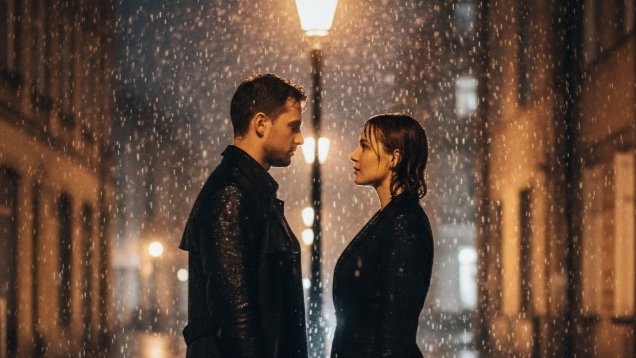 Ubah foto menjadi pasangan yang berdiri berhadapan di bawah cahaya lampu jalan saat hujan malam. Pria dan wanita memakai outfit serasi warna hitam yang basah karena hujan.