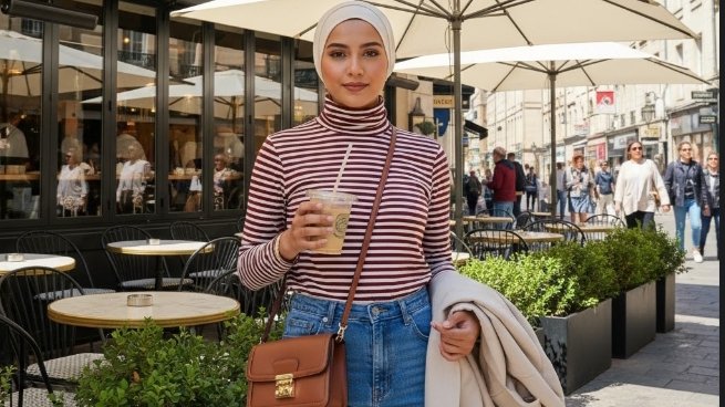 Edit foto wanita muda berhijab sedang berjalan di luar ruangan di depan kafe Eropa dengan tulisan “RESTAURANT BAR”. Ia memakai hijab berwarna krem polos, baju kaos lengan panjang garis-garis mahogany putih model turtleneck, celana jeans biru high waist, dan tas selempang kulit coklat dengan kunci emas. Di tangan kanan ia memegang gelas kopi dengan sedotan, dan di tangan kiri membawa blazer berwarna baige terang. Latar belakang ada meja dan kursi kafe outdoor dengan payung putih besar, tanaman hijau, serta suasana jalanan Eropa yang cerah dan stylish.