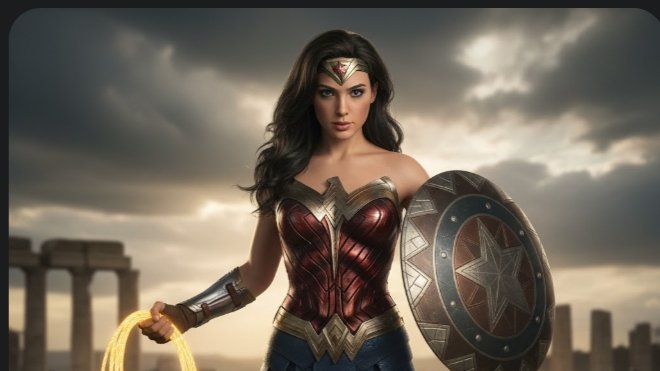 Berdasarkan foto yang diunggah, jangan ubah wajah. Rekayasa foto bertema Wonder Woman, kostum prajurit Amazon merah-biru dengan tiara emas, memegang Lasso of Truth bercahaya emas. Pose berdiri gagah dengan satu tangan mengangkat perisai, latar belakang medan perang dengan langit berawan dramatis. Pencahayaan cinematic warm tone dari depan kiri. Kamera Canon EOS 5D Mark IV, lensa 50mm f/1.2, angle medium shot tegak lurus dari depan.