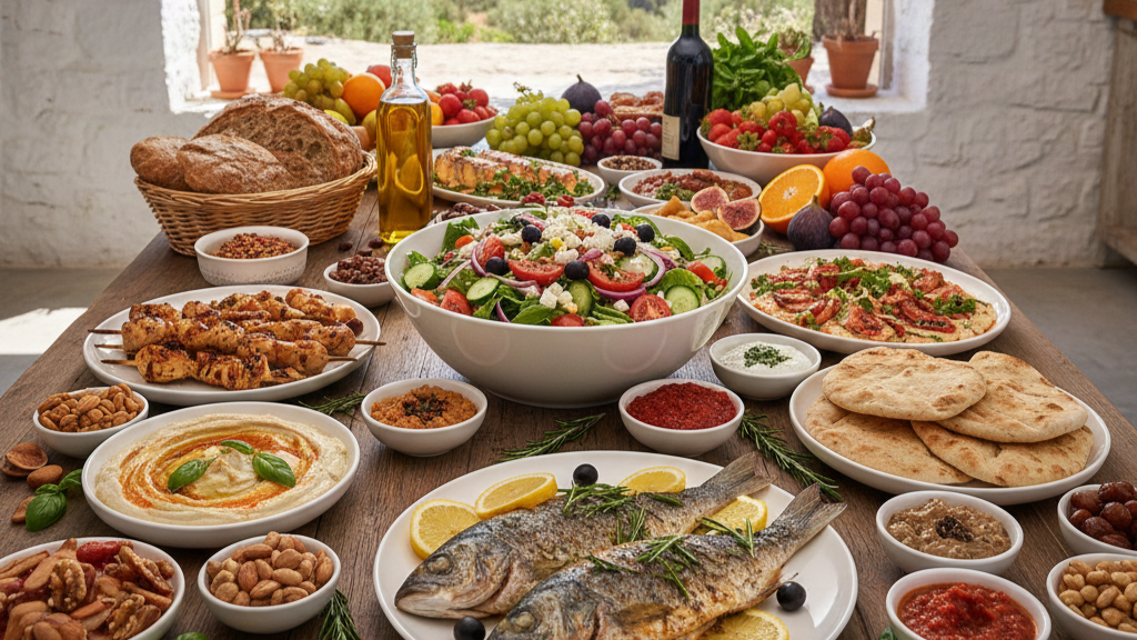Diet Mediterania merupakan pola makan berbasis nabati, lemak sehat, ikan, biji-bijian, sayuran, buah, kacang-kacangan, minyak zaitun.