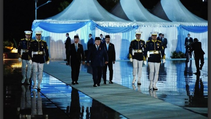 Ketika tiba di TMP Kalibata, Presiden Prabowo disambut oleh Wapres Gibran Rakabuming Raka, kemudian berjalan menuju lokasi terselenggaranya upacara dengan vibes dominasi warna biru.