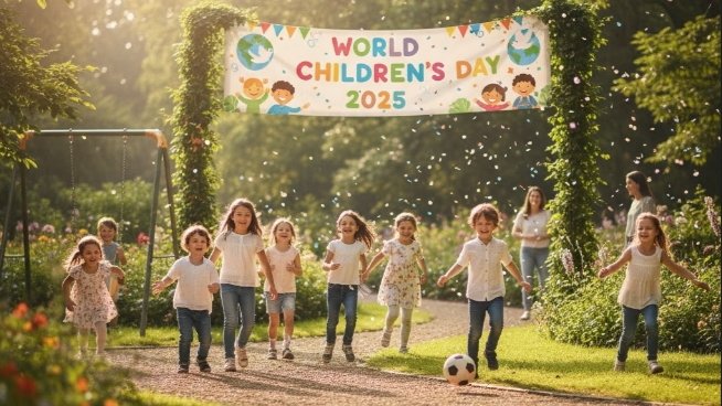 Suasana perayaan Hari Anak Sedunia 2025 yang penuh suka cita, edit foto anak-anak yang sedang memegang balon berwarna biru dan putih, sinar matahari yang lembut, wajah-wajah yang tersenyum, latar belakang yang terinspirasi UNICEF, confetti yang berkibar, gaya ilustrasi datar modern.