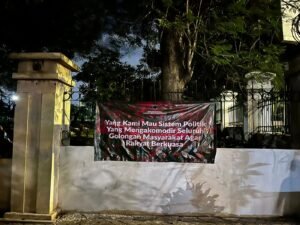 Spanduk tersebut mengatasnamakan kelompok Perserikatan Sosialisme Demokrasi Kebangsaan (PSDK).