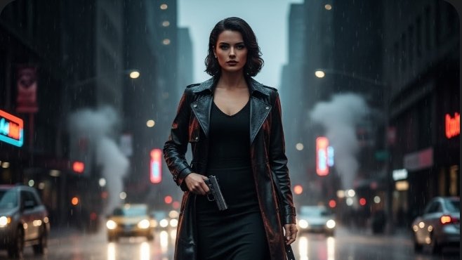 1.Wanita mafia elegan berjalan di tengah jalan kota saat hujan gerimis, mengenakan mantel kulit panjang hitam, rok pensil hitam, high heels hitam, dan membawa pistol kecil tersembunyi. Jalanan basah memantulkan cahaya lampu kota, nuansa gelap dan dramatis.