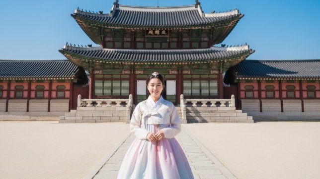 Edit foto saya agar saya mengenakan Hanbok tradisional Korea yang cantik (misalnya, merah muda pastel dan biru muda). Saya berdiri dengan anggun di halaman utama Istana Gyeongbok, dengan arsitektur tradisional yang terlihat jelas di latar belakang. Hari ini cerah dan terik.